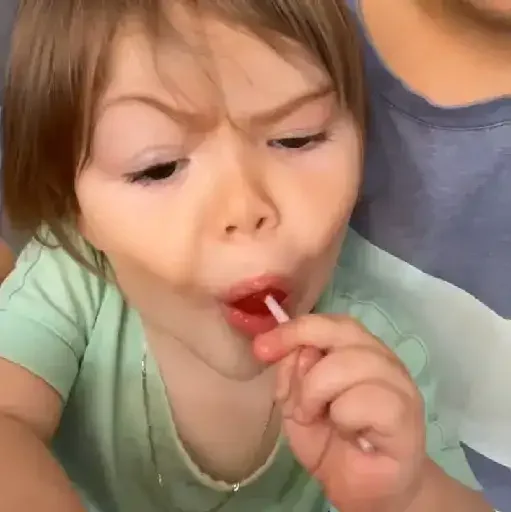 Menina pequena com franja e cabelo castanho, vestindo uma blusa verde claro, aplicando batom ou brilho labial com uma mão.