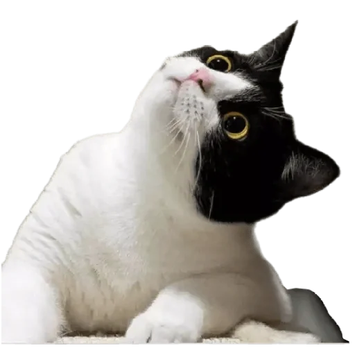 Gato preto e branco olhando para cima com olhos verdes.