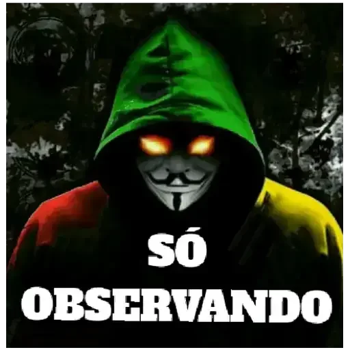 Um personagem com capuz verde, máscara de Guy Fawkes e olhos laranjas brilhantes. Ele está usando uma jaqueta com as cores do arco-íris. Abaixo dele, está escrito 'SÓ OBSERVANDO'.