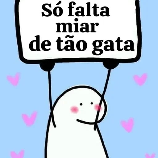 Um desenho de um personagem branco e redondo com rosáceas cor-de-rosa nas bochechas e um sorriso, segurando um cartaz com o texto 'Só falta miar de tão gata' em um fundo azul com corações rosa.