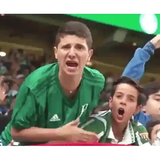 Dois jovens torcedores de futebol, um mais alto que o outro, ambos com expressão de muita emoção e boca aberta, usando camisas verdes com detalhes brancos e um Adidas.