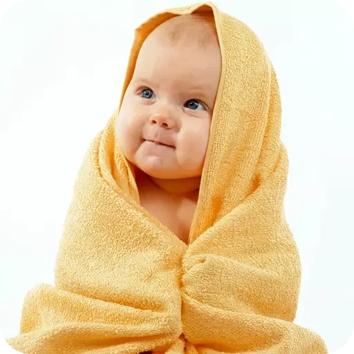 Bebê enrolado em uma toalha amarela, com expressão curiosa e olhos azuis.