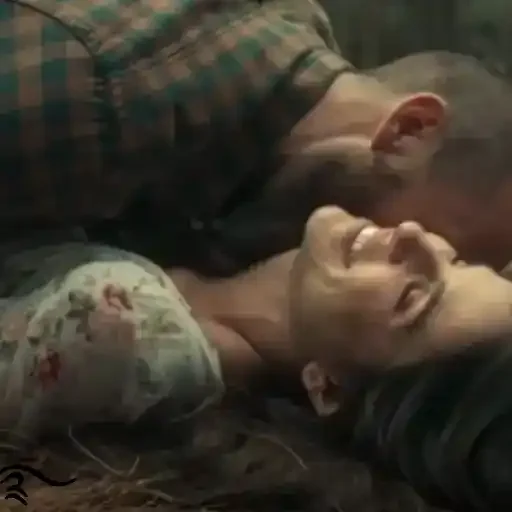 Cena de filme ou série com homem e mulher deitados, ele com camisa xadrez e ela com blusa floral, ambos de olhos fechados.