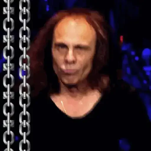 Homem com cabelo castanho e careca no topo da cabeça, vestindo uma blusa preta, com correntes ao lado esquerdo e fundo azul escuro.
