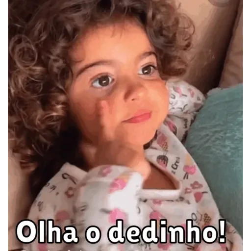 Menina com cabelo castanho encaracolado e expressão curiosa, usando uma camisa branca com estampas de animais cor-de-rosa. A legenda 'Olha o dedinho!' aparece embaixo.