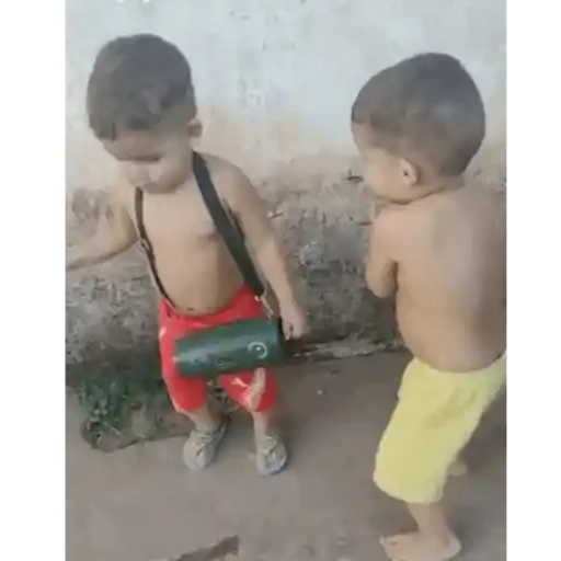 Duas crianças pequenas, sem camisa, uma com calça vermelha e outra com calça amarela, em frente a uma parede.