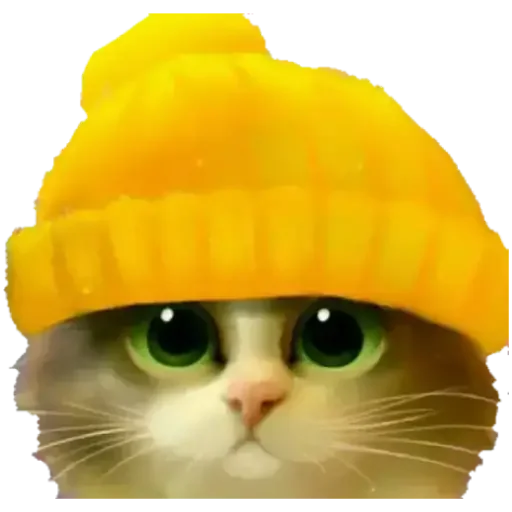 Gato com olhos verdes e chapéu amarelo, parecendo sério.