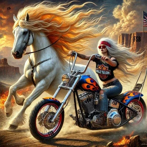 Uma mulher loira com óculos de sol e bandana vermelha está sentada em uma motocicleta com uma caveira laranja e azul, enquanto um cavalo branco com uma longa crina laranja galopa ao lado, em meio a chamas e fumaça.