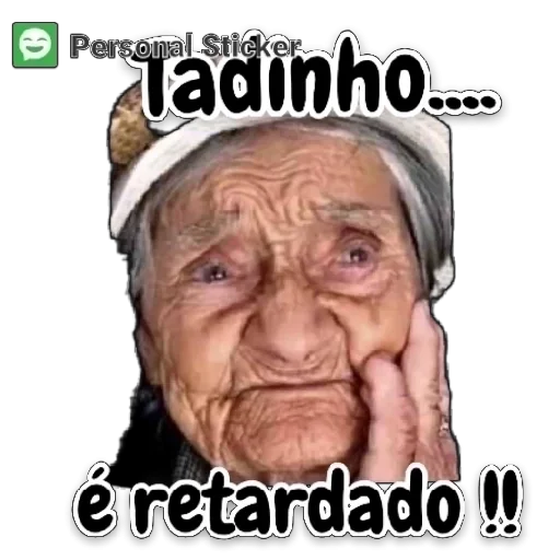 Uma mulher idosa com expressão triste e mão no rosto, com o texto 'Tadinho... é retardado!!'