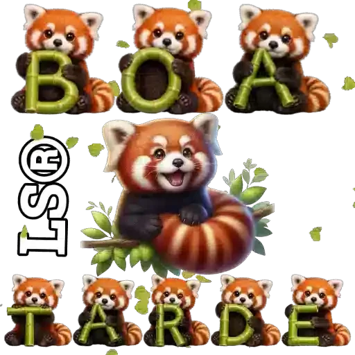 Um grupo de pandas vermelhos fofos com a frase 'Boa Tarde' em letras verdes. O panda central está sorrindo e cercado por folhas.