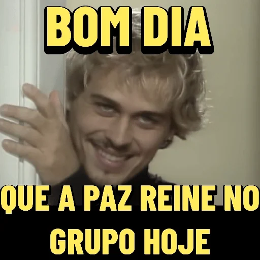 Um homem com cabelo loiro e expressão de surpresa ou medo, com as mãos na parede, e o texto 'BOM DIA QUE A PAZ REINE NO GRUPO HOJE' em letras amarelas.
