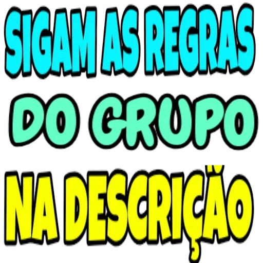 Um texto em letras maiúsculas coloridas que diz 'SIGAM AS REGRAS DO GRUPO NA DESCRIÇÃO'. As palavras estão em azul, verde e amarelo.