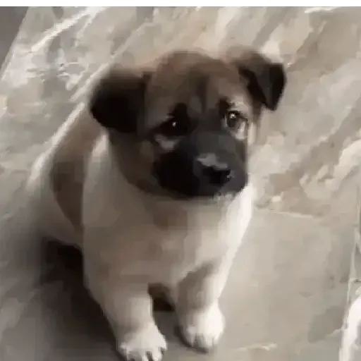 Um filhote de cachorro com pelagem branca e marrom, focinho preto, sentado em uma superfície cinza com uma expressão curiosa.