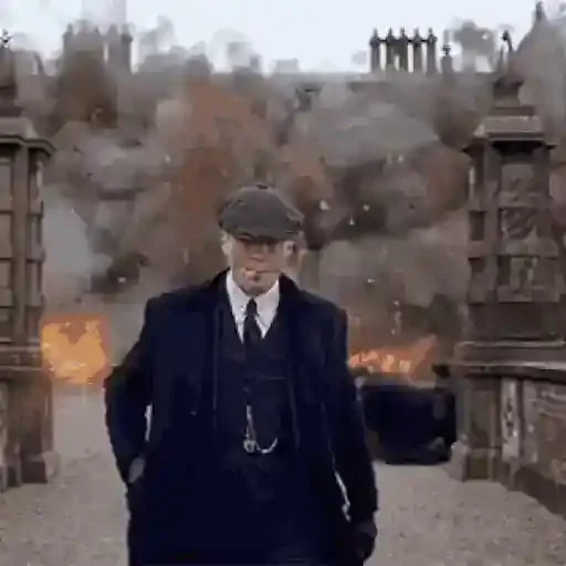 Um homem de meia-idade, vestido com um terno preto, camisa branca e gravata preta, usando um chapéu plano cinza, olhando para baixo com as mãos nos bolsos, em frente a um cenário de uma ponte ou portão com fogo ao fundo.
