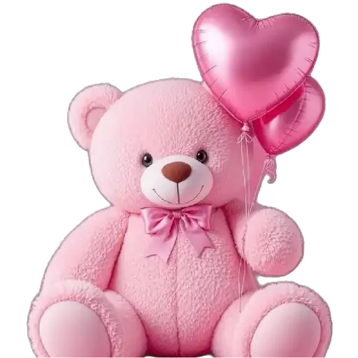 Um ursinho de pelúcia rosa com um laço rosa no pescoço, segurando três balões em forma de coração rosa.