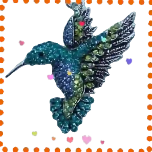 Um beija-flor azul e verde brilhante em voo, coberto de pedras preciosas, com corações coloridos ao redor.