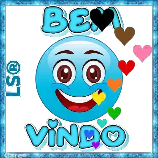 Um emoji azul sorridente com olhos castanhos e vários corações coloridos ao redor, com a inscrição 'BEM-VINDO' em letras azuis.