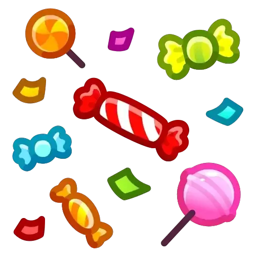 Conjunto de doces coloridos, incluindo balas e pirulitos.