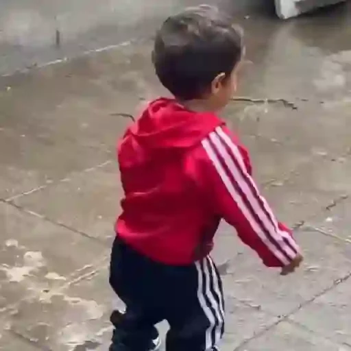 Menino pequeno de costas, usando um casaco vermelho com listras brancas nas mangas e calças pretas com listras brancas.