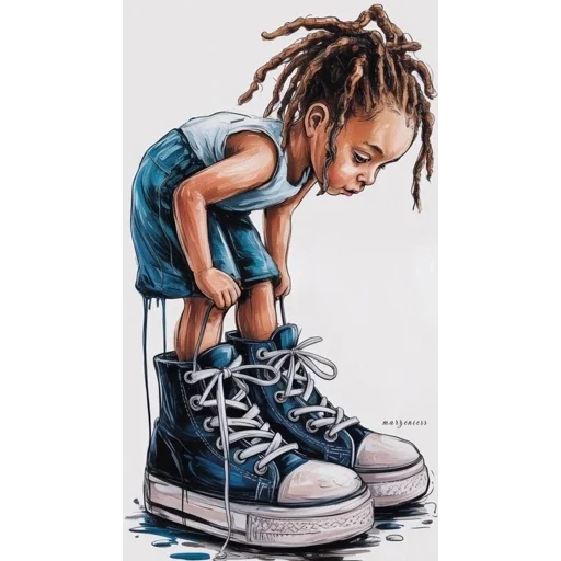Menino com dreadlocks, vestido com uma camiseta azul e bermuda, olhando para baixo enquanto amarra seus enormes tênis pretos.