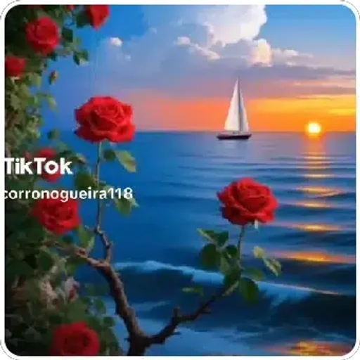 Um pôr do sol sobre o mar com um veleiro ao longe. Rosas vermelhas em primeiro plano e a marca 'TikTok' no canto.