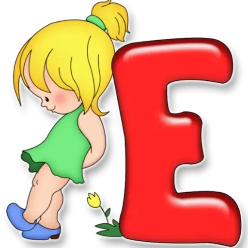 Uma menina de cabelo loiro e vestido verde ao lado de uma letra 'E' vermelha gigante, com um pequeno lírio amarelo.