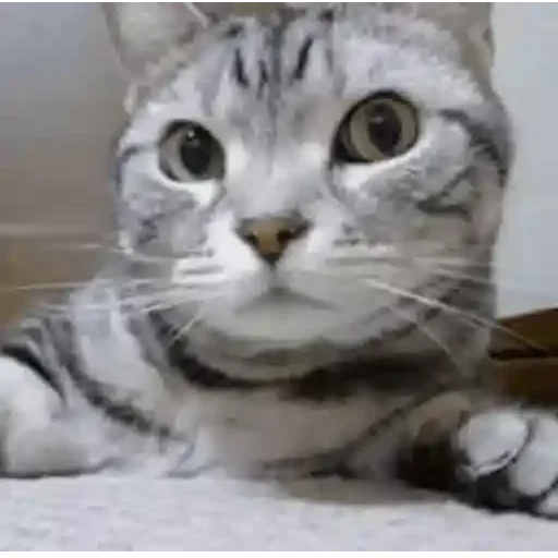 Gato cinza com olhos grandes e pelagem listrada, deitado e olhando para frente com expressão curiosa.