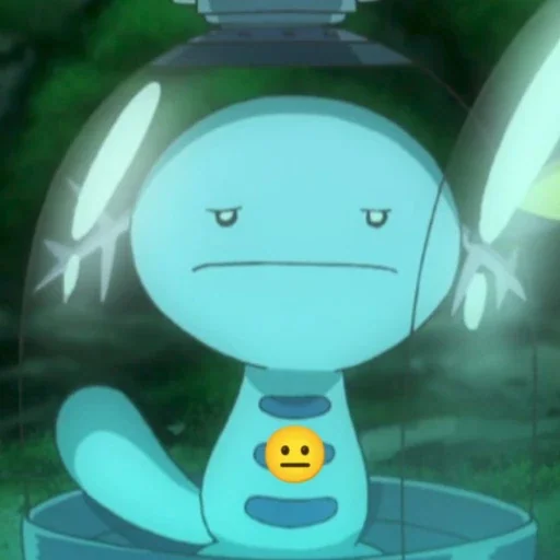 Um Pokémon azul claro com expressão de descontentamento, dentro de uma esfera transparente.