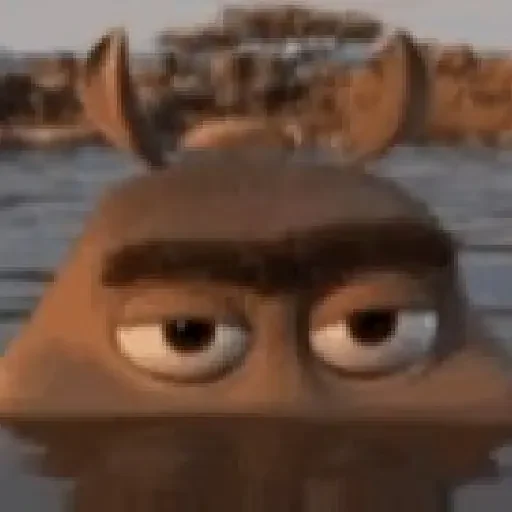 Rosto de um personagem de desenho animado com olhos arregalados e sobrancelhas grossas, fundo desfocado.