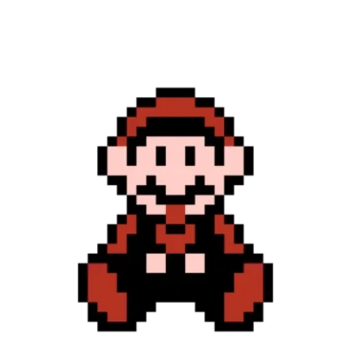 Personagem de pixel com chapéu e roupa vermelha e preta, sorriso largo.