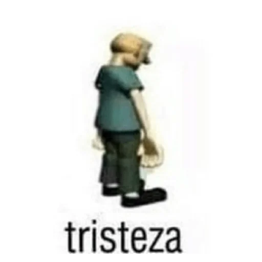 Um personagem de desenho animado com expressão triste, vestindo uma camisa verde e calça preta, com a palavra 'tristeza' escrita abaixo.