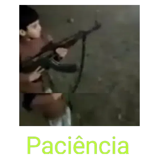 Um homem com um rifle, parecendo ter uma expressão de concentração ou paciência, com a palavra 'Paciência' abaixo da imagem.