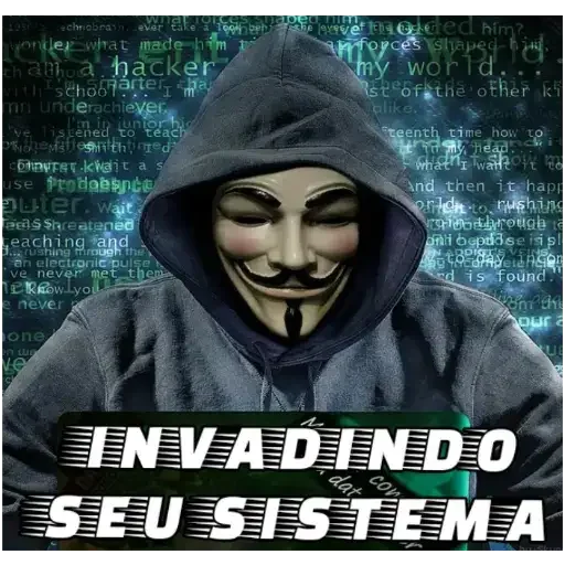 Um homem com máscara de Guy Fawkes e capuz cinza invade um sistema, com o texto 'INVADINDO SEU SISTEMA' em destaque.