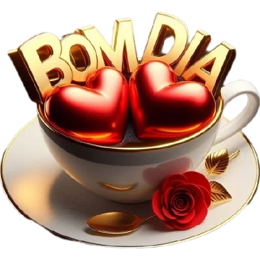 Um bule de café com dois corações vermelhos dentro, a palavra 'BOM DIA' em letras douradas acima e uma rosa vermelha ao lado, em um pires branco com detalhes em dourado.