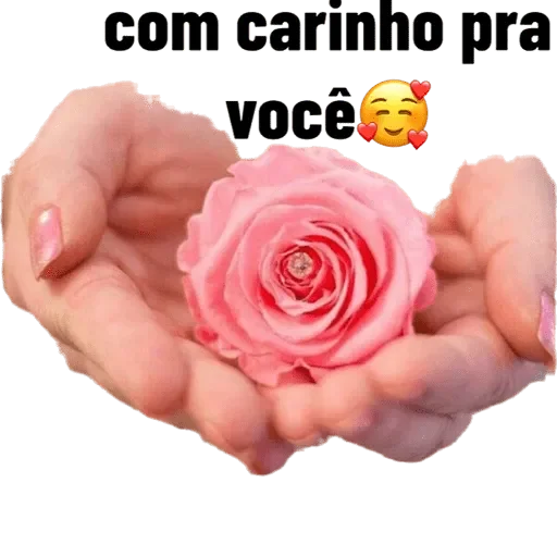 Mãos segurando uma rosa rosa com texto 'com carinho pra você' e um emoji de rosto sorridente com coração nos olhos.