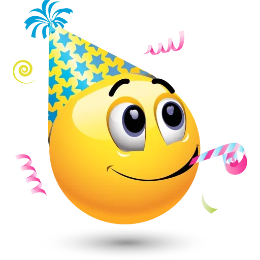 Um emoji amarelo com um chapéu de festa azul e estrelas, sorrindo e com uma expressão feliz, segurando uma caneca de sorvete.
