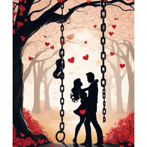 Um casal se beija em um balanço em um cenário romântico com árvores, folhas e corações vermelhos.
