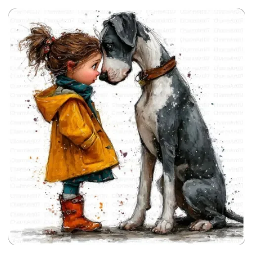 Menina com casaco amarelo e botas laranja beija um cachorro cinza e branco no focinho. O cachorro usa uma coleira marrom.