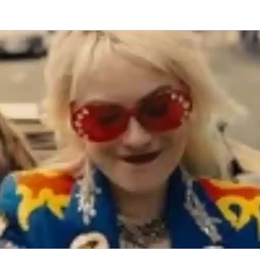 Uma mulher loira usando óculos de sol vermelhos com detalhes brancos e um casaco azul com detalhes coloridos.
