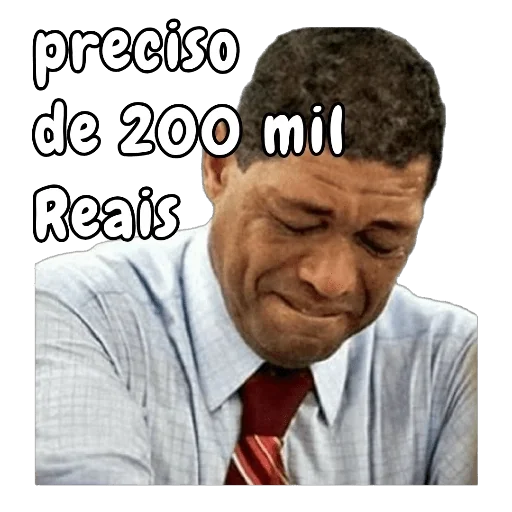 Homem com expressão de desaprovação ou preocupação, vestindo camisa branca e gravata vermelha, com o texto "preciso de 200 mil Reais" sobreposto.