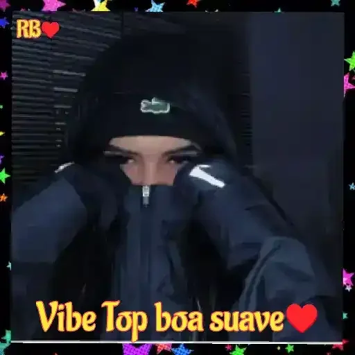 Um jovem com touca preta e jaqueta, mãos no rosto, com texto 'Vibe Top boa suave' em amarelo na parte inferior. Fundo escuro com estrelas coloridas.