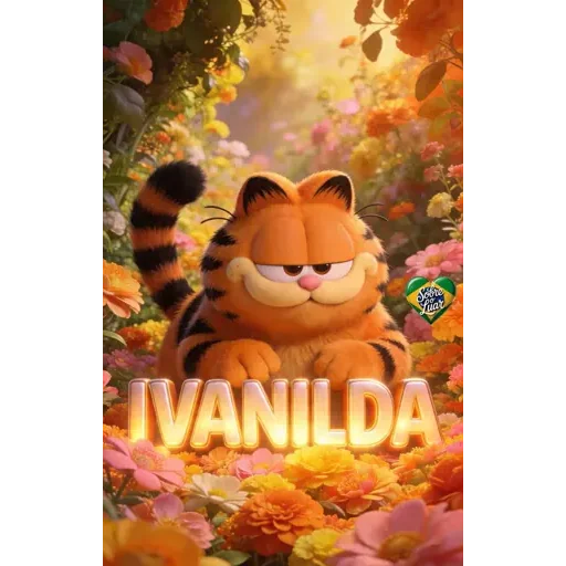 Gato laranja com manchas pretas em um jardim de flores coloridas. O gato tem um olhar relaxado e o texto 'IVANILDA' em letras grandes e iluminadas na frente.
