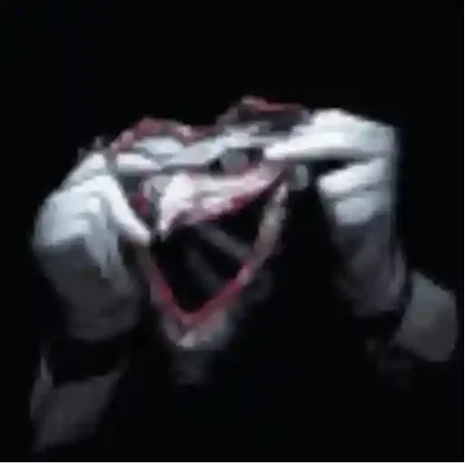 Mãos brancas com luvas pretas segurando uma máscara de coração vermelho com uma expressão de surpresa ou choque, contra um fundo preto.