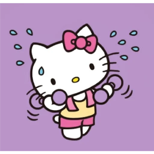 Hello Kitty suando, com uma expressão de esforço, vestindo uma roupa rosa e amarelo, com um laço rosa no cabelo, em um fundo roxo com gotículas azuis.