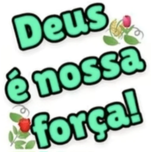 Uma figurinha com a frase 'Deus é nossa força!' em letras grandes e verdes, com flores e folhas ao redor.