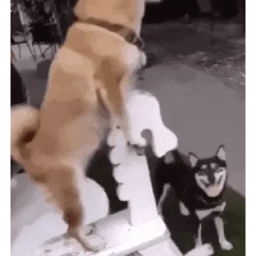 Um cachorro castanho e um cachorro branco com uma pessoa ao fundo vestida de rosa. O cachorro castanho está em cima do…