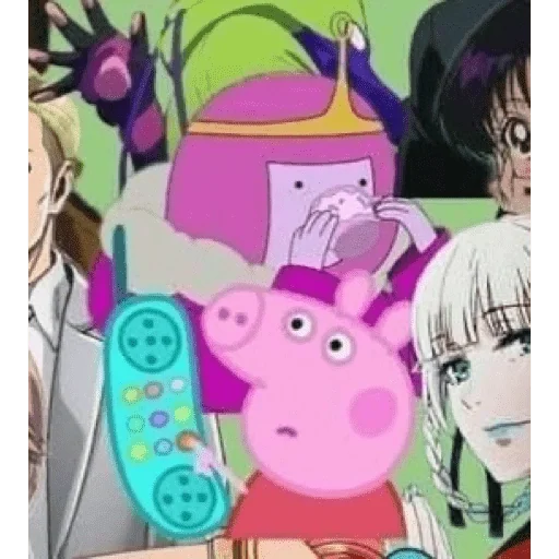 Personagem rosa de Peppa Pig com um telemóvel azul, rodeado de personagens de anime e outro boneco.