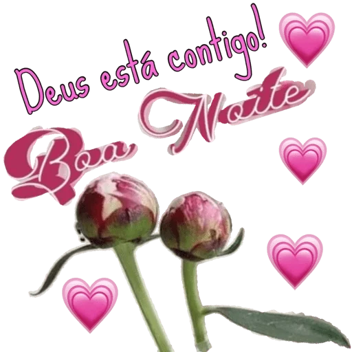 Duas flores rosadas fechadas com folhas verdes, texto 'Deus está contigo! Boa Noite' em rosa e roxo, e seis corações rosas ao redor.