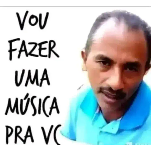 Um homem com cabelo curto e uma camisa azul olhando para frente, com o texto "VOU FAZER UMA MÚSICA PRA VC" escrito ao lado esquerdo.