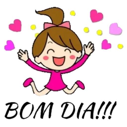 Menina de cabelo castanho com um laço rosa, vestindo uma roupa rosa, pulando com os braços levantados e rodeada de corações rosa e amarelos. Abaixo dela está escrito 'BOM DIA!!!'